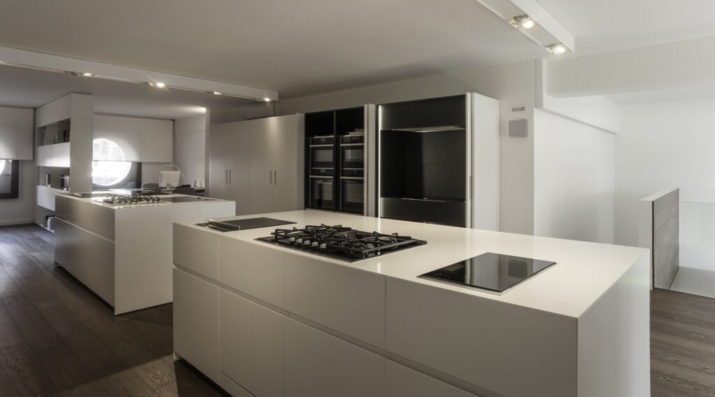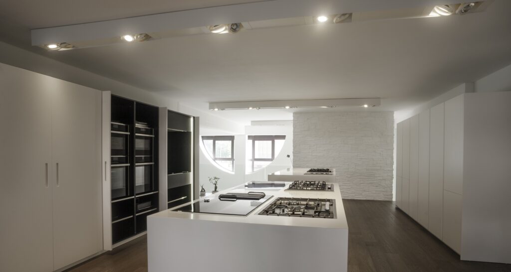 Uno showroom per portare la cucina professionale a casa tua, dove chi viene a cena ne possa apprezzare lo stile, il calore, la ricerca: uno spazio estetico in cui gli elettrodomestici sono in mostra come in una galleria.